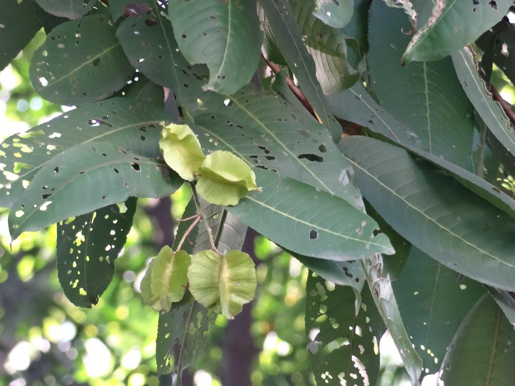 | Description | : | Large tree upto 25m high with distinct rough grey deeply cracked bark into oblong segments. Leaves alternate, elliptic-oblong or ovate, 8.3-34x5.4-16.5cm, sparsely hairy abov, densely covered with soft pubescence beneath, base usually oblique, apex actue, margin entire or obscurely serrate; petiole upto 1cm long with 2 large glands on it or at the base; with secondary nerves 6-17 pairs, raised beneath, curving just below the margin. Flowers greenish yellow, bisexual, in axillary and terminal panicles. Calyx villous, lobes ovate- triangular. Fruit 5-winged, with horizontal veins. |