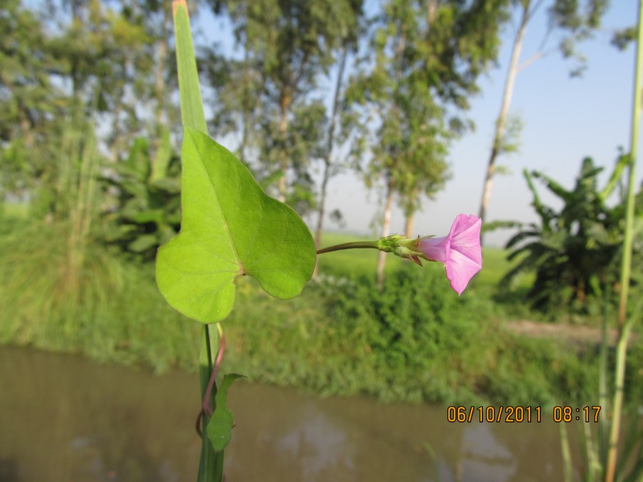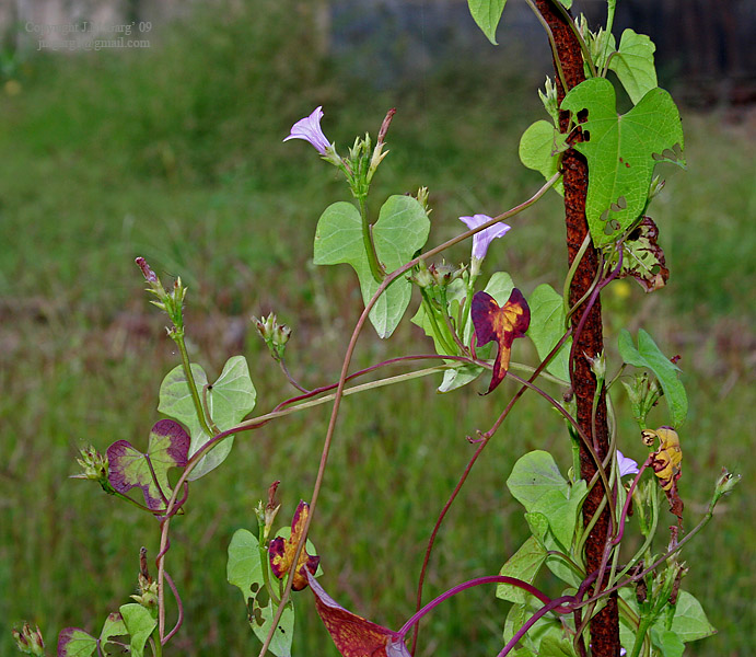 | Description | : | Little Bell is a small, herbaceous twiner, often on grasses or low shrubs, not high-climbing, with milky sap. The flowers are rather small for morning glories. Leaves are heart-shaped, fine-tipped, entire or 3-lobed, mostly 2-5 cm long (but up to 12 cm), longer than wide. Leaf stalk is as long as blade or longer by half. Stems are somewhat angled, hairless or velvet-hairy. Flowers 1 or few on stalks as much as 10 cm long. Sepals are lance-like. Flower tube is 5-lobed, funnel-shaped, 1.5 cm long. Flower color is variable around the world. In India it is light pink with a deep red-violet. Stamens remain inside the flower tube. Little bell is probably native to West Indies, but now naturalized throughout the tropical world. |