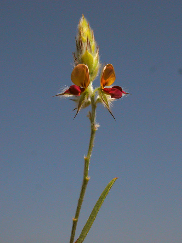 | Description | : | An erect or diffuse herb. Stem is slender and weak, with trailing, hairy branches. Leaves are pale-green, hairy, narrow, linear, 3-6 cm long, pointed, with a rounded base. Stalkless flowers are borne in densely hairy erect spikes at the end of branches, 5-15 cm long. Sepal linear-lanceshaped, spine-tipped. Beautiful flowers are 8 mm across, with a yellow standard petal, red wings and dark-pink keel. Flowers open in the morning. Flowers open in pairs, starting from the base of the spike. |