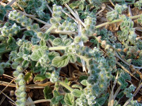 | Description | : | Prostrate branched annual. Branches brown-tomentose with dense appressed hairs up to 1 mm long. Leaves petiolate, greyish white with dense hairs; petiole up to 15 mm long. Lamina 10-20 x 5-12 mm, ovate to obovate or elliptic, cuneate to ± oblique, entire-undulate, obtuse, nerves impressed on upper surface. Inflorescence lateral and terminal, 2-7 cm long; flowers uniseriate. Calyx deciduous, ± 2.5 mm long, up to 5 mm in fruit, ¼th partite into ± obtuse lobes, densely hairy. Corolla tube 34 mm long, retroresely hairy to the outside, glabrous within lobes oblong, shallow, erect. Anthem c. 1 mm long, narrowed towards the apex, attached c. 1.5 mm from the corolla base. Stigma c. 0.6 mm long, conical; stigmatic ring prominent. Style ± stigma length, with few retrorse hairs. Ovary glabrous. Fruit globose, enclosed in the persistent calyx. Nutlets c. 2.5 mm long, ovoid in outline, glabrous, back rugulose and minutely tubercied.