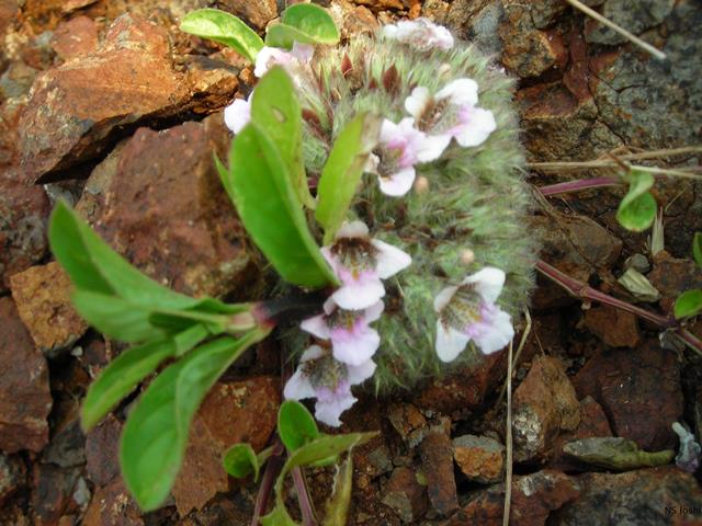 | Description | : | a perennial herb, with almost no stem. Branches, 20 cm long, arise out of a globose head on the ground, and spread out. Leaves are stalkless, 3-6 x 0.5-1 cm, linear-lanceshaped, velvet-hairy, pointed at both ends, margin entire to toothed. Flowers are also arise stalkless from this globose head. Flowers are pale pink, 2-lipped. The upper lip is notched, and the lower lip is divided into 3 lobes. It appears in dry places and waste lands. |