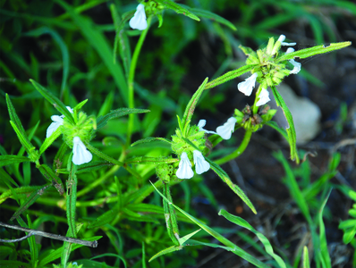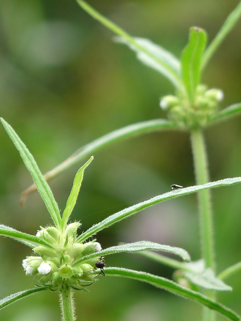 | Description | : | Herbs annual, 20-40 cm tall. Stems hispid. Petiole short to obsolete, densely hispid; leaf blade linear or oblong-linear, 2.5-6 × 0.8-1.5 cm, strigose especially on veins abaxially, base cuneate-decurrent, margin sparsely crenate or sometimes subentire, apex obtuse, lateral veins ca. 3 pairs. Verticillasters globose, 2-2.5(-3) cm in diam., many flowered, densely hispid; bracts linear, as long as calyx, margin hispid ciliate, apex slightly spinescent. Calyx tubular, ca. 1 cm, slightly constricted at apex, slightly hispid or subglabrous at base, otherwise densely hispid outside; mouth oblique, erect; teeth straight, broadly triangular, apex spinescent. Corolla white, slightly longer than calyx tube, ca. 1.2 cm; tube ca. 8 mm; lower lip spreading, middle lobe largest. Nutlets brown, oblong, triquetrous, ca. 2 mm, shiny. Fl. and fr. year round. |