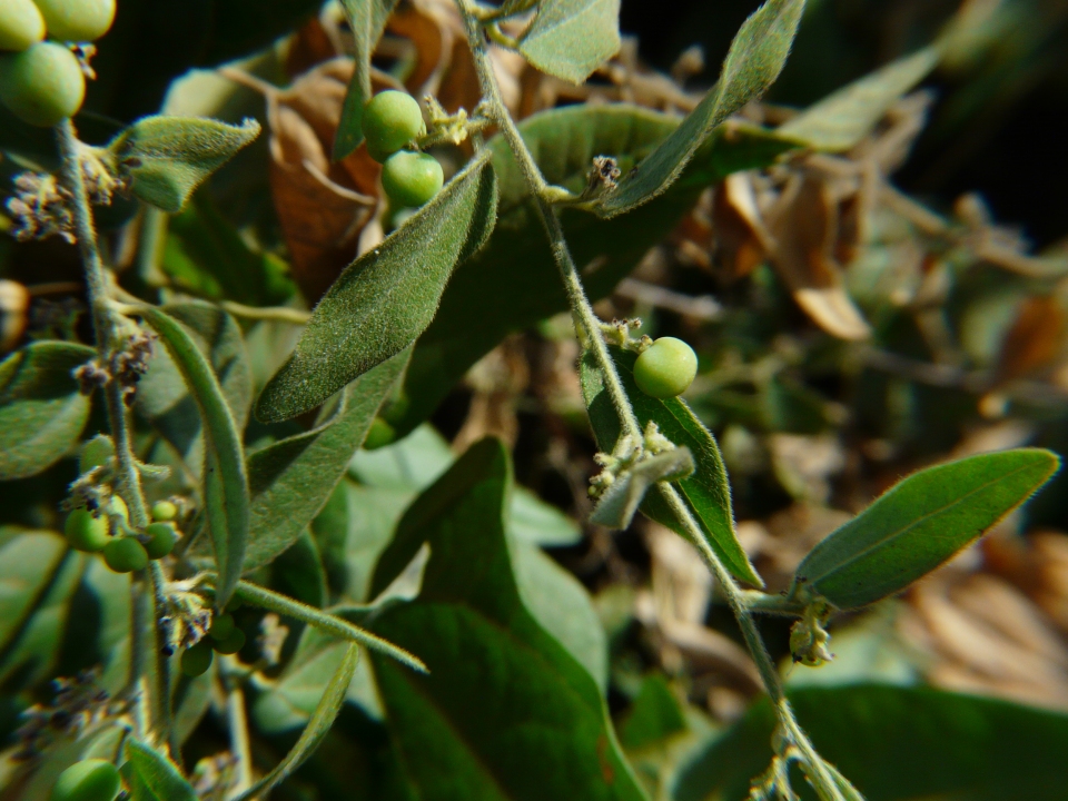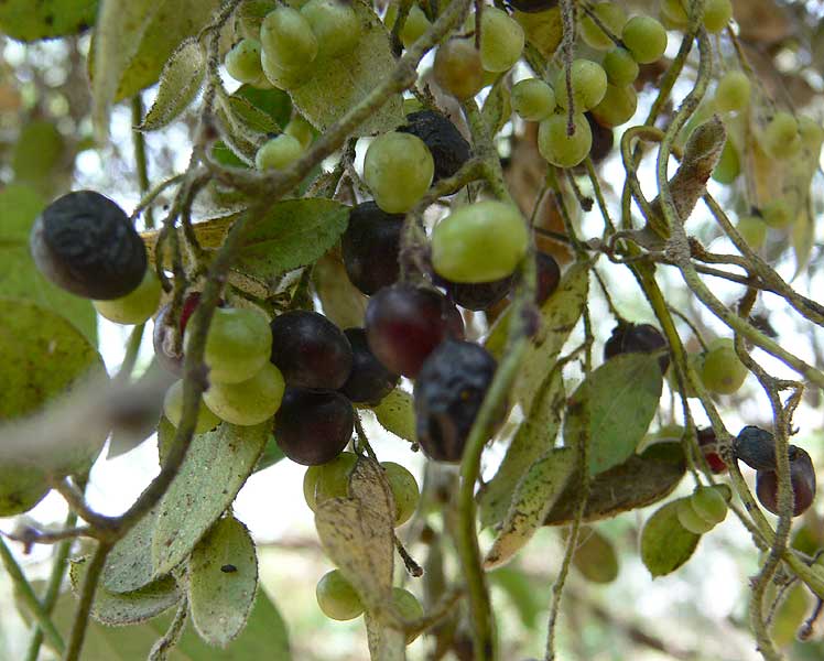| Description | : | a climbing undershrub, often densely velvety. Leaves are 4-8 cm long, 2.5-6 cm broad, ovate or ovate-oblong, sometimes 3-5-lobed, base heart-shaped, wedge-shaped or flat, tip blunt or with a small point. Leaves are densely velvety when young, later nearly hairless. Basal nerves are 3-5. Leaf stalk is 0.5-2.5 cm long. Male flowers have sepals hairy, the outer 3, oblong-lanceshaped, 1.5-2 mm long, 0.5-0.8 mm broad, the inner 3 broadly ovate, 1.5-2.5 mm long, 1.7-2 mm broad. Petals are ovate- oblong, 0.5-1.5 mm long, 0.3-6 mm broad. Stamens are 0.7-1 mm long. Female flowers 1-3, on axillary stalks, rarely racemed. Fruit is a dark purple berry, 4-8 mm long, 4-5 mm broad, endocarp annular or ribbed with a prominent dorsal crest, perforated. The juice of the ripe fruit yields a permanent bluish-purple ink and the roots as well as the leaves are used in native medicine and as a tonic like the last species. Flowering: December-March. |