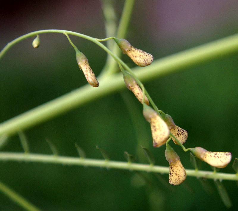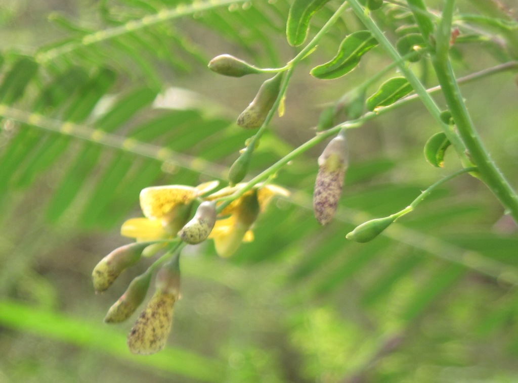 Herbs, perennial, suffrutescent, 1-3 m tall. Branches terete, slightly with greenish white striations, often with small sparse flattened prickles. Stipules linear-lanceolate, ca. 7 × 1 mm, caducous, glabrous, apex acuminate. Leaves 40-80-foliolate; rachis 13-30 cm, abaxially with sparse prickles, adaxially grooved; stipels acerose, slender; leaflet blades linear-oblong, 10-16 × 2-3 mm, both surfaces with dense appressed purplish brown glands and glabrous, abaxially grayish green, adaxially green, base rounded, apex obtuse and with a mucro. Racemes 5-10 cm, 2-6-flowered; peduncle often with prickles; bracts linear-lanceolate, ca. 3 mm, caducous, with sparse appressed trichomes. Flowers 0.9-1.2 cm. Pedicel 6-8 mm, slender; bracteoles 2, ovate-lanceolate, caducous, glabrous. Calyx campanulate, ca. 4 mm, glabrous; teeth 5, shortly triangular. Corolla yellow; standard subovate, ca. 1 cm, longer than wide, outside with reddish brown dots, with a triangular callus, base tapering into a claw, apex retuse; wings oblong, with long claw, auriculate at one side; keel long obovate, with a dentiform auricle at base. Stamens 0.9-1.2 cm; anthers obovoid, outer side brown. Pistil linear, as long as stamens; style slender; stigma capitate. Legume dark brown, terete, straight to slightly falcate, 15-22 cm × ca. 3 mm, trabeculate, slightly constricted and with a ca. 5 mm separation between seeds, apical beak 1-1.2 cm. Seeds numerous per legume, subterete, ca. 3 × 2 mm; hilum rounded. Fl. and fr. Aug-Dec. 2n = 12, 13, 14.