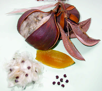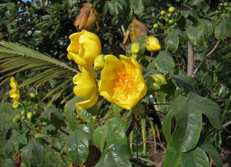 Deciduous trees, to 10 m tall, bark 20-25 mm thick, surface dark grey, fibrous; branchlets thick. Leaves simple, palmately 3-5 lobed, alternate, estipulate; petiole 6-20 cm long, stout, swollen at base, pubescent; lamina 5-15 x 7-20 cm, base cordate, lobes, elliptic or elliptic-lanceolate, tips acute or acuminate, margin entire or crenate, serrate, glabrous above, densely white tomentose below, coriaceous; 5-7 nerved from the base, palmate, lateral nerves 7-10 in each lobe, parallel, prominent, intercostae scalariform, faint. Flowers bisexual, 7.5-10 cm across, bright yellow, in grey tomentose terminal panicles; sepals 5, 2.5 x 1.5 cm, unequal, obovate, densely tomentose, deciduous; petals 5, 5 x 3 cm, obovate, deeply emarginate, contorted; stamens many, inserted on an eglandular disc, shortly connate at base into 8-10 clusters; filaments 1.5-2.5 cm long; anthers linear, opening by apical slit; ovary superior, globose, glabrate, 3-5-celled, ovules many; style 1, to 1 cm, filiform; stigma somewhat lobed. Fruit a capsule, 6-8 x 4.5-5.5 cm, 5-valved, obovoid, pear shaped, straight, leathery, brown; seeds many, 6 mm long, black, curved, embedded in white cotton.