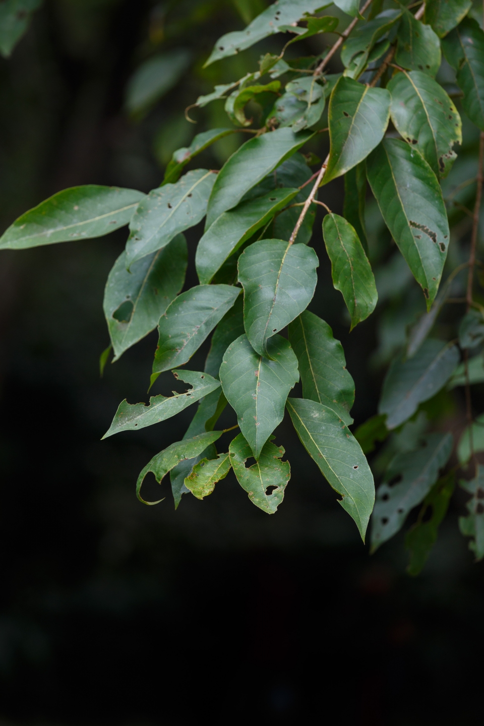 Deciduous trees, to 25 m high, bark 5-6 mm thick, surface dark brown to black, fissures shallow, vertical, exfoliating in thick scales; blaze yellowish-brown; young shoots densely pubescent; branchlets brownish or greyish, glabrous. Leaves simple, opposite to alternate, exstipulate; petiole 12-25 mm long, stout, grooved above, pubescent, 2 sessile glands at the top; lamina 9.5-28 x 4-13 cm, ovate, elliptic, obovate or elliptic-obovate, base round, obtuse, oblique or subtruncate, apex acute, acuminate, obtuse or apiculate, margin entire, glabrous above tawny villous beneath, coriaceous; lateral nerves 6-12 pairs, pinnate, ascending, prominent, arched towards the margin, intercostae reticulate, prominent. Flowers bisexual, greenish-white, 5-6 mm across, in terminal and axillary spikes with offensive smell; bracts 2-3 mm long; calyx tube 1.5-2.5 × 0.8-1 mm, villous, constricted above the ovary, lobes 5, creamy, triangular, 1.5 mm; petals 0; stamens 10 in 2 rows; filaments 4-6 mm; disc 5-lobed, villous; ovary 2 mm long, inferior, densely villous, 1-celled; style 5 mm, subulate; stigma terminal. Fruit a drupe 3-4 x 2-2.5 cm, obovoid, woody, obscurely 5 angled, glabrous, greenish-yellow; seed one.