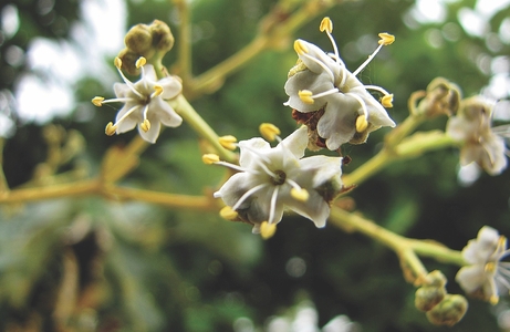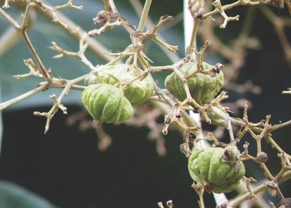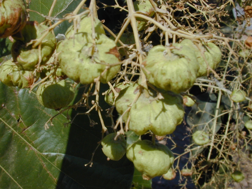 | Description | : | Deciduous trees, to 30 m high, bark 10-20 mm thick, yellowish-brown, rough, shallowly vertically fissured, fibrous; blaze pale yellowish concentrically lamellate; bole often fluted at base; branchlets 5-10 mm thick, 4-angled, puberulous. Leaves simple, opposite, estipulate; petiole 10-50 mm long, stout, tomentose; lamina 30-60 x 15-30 cm, ovate, obovate, base attenuate, apex acute or obtuse, margin entire, wavy, glabrous above and pubescent below with minute red glands, coriaceous; lateral nerves 8-10 pairs, pinnate, prominent, raised beneath, puberulent beneath; intercostae scalariform, prominent. Flowers bisexual, white, 7 mm across, in terminal cymose panicles, 10-30 cm across, puberulus; calyx 5 mm long, campanulate, lobes 5-6, subequal, ovate, tomentose; corolla 6 mm long, lobes 5-6, oblong, spreading; stamens 5-6, equal, erect, inserted at the throat, exserted; filaments 3 mm; anthers oblong; ovary globose, superior, densely hairy, 4-celled, 1 ovule in each cell; style slender, 4 mm; stigma linearly bifid. Fruit a drupe, 1.5-2 cm across, globose, brown, densely floccose hairy, covered by the inflated calyx, epicarp spongy, endocarp stony; seeds 1-4, oblong. |