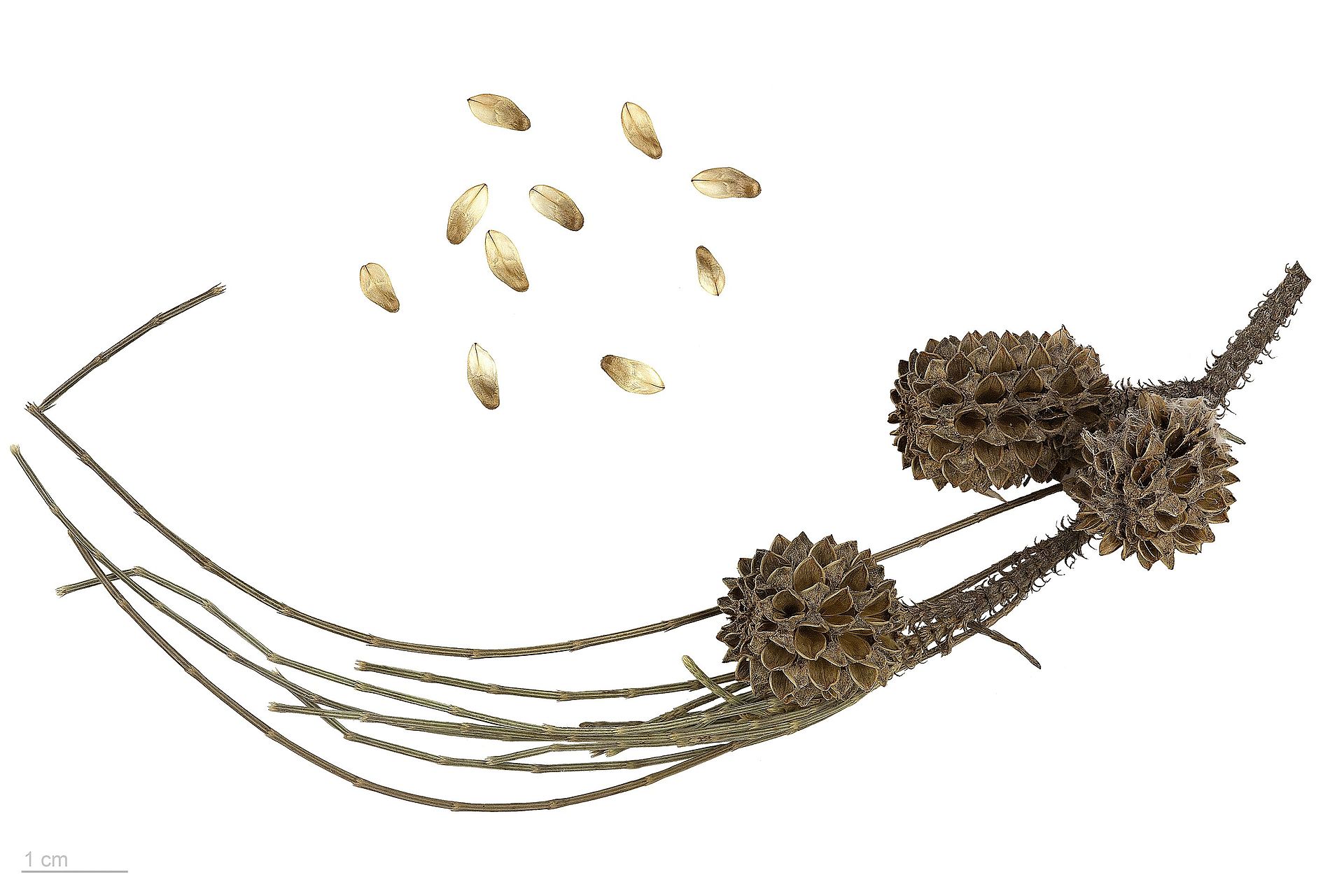 Trees, 10-30 m tall, monoecious. Bark greyish brown or dark brown. Branchlets 1-1.5 mm in diameter, jointed; internodes 6-8 mm long with 6-8 prominent ridges; nodal leaf-sheaths with 6-(7)- 8 teeth, pale green, united at base into a short tube, free part 0.5-1.0 x 0.3-0.5 mm, glabrous but margins shortly ciliate. Male inflorescence 15-40 mm long, 2-4 mm in diameter, bracts arranged in 10-25 whorls and each whorl having 6-7 bracts with one flower in each bract; bracteoles membranous, ovate, acute, 0.5-1.0 x 0.2 mm, tepals 2, membranous, 0.5-0.8 x 0.5 mm. Filaments exserted, 2.0-2.5 mm long; anthers 2-celled, 1-1.5 mm long, reddish-brown. Female inflorescence in scattered or clustered ovoid-subglobose heads, 4-8 mm long, stalk 2-12 mm long, bracts ± similar to those of male inflorescence; perianth 0, pistil bicarpellary, ovary unilocular with 1-2 acending ovules; stigmas 2-3 mm long, exserted, red. Infructescence globose-oblong, 15-30 x 12-15 mm; 8-9 whorls of paired infructescence valves; 7-8 valves in each whorl, alternating with the valves located in the next whorl, obovate-oblanceolate, acute. Samaras 4-8 mm long, yellowish brown. Fl. Per.: December-March.