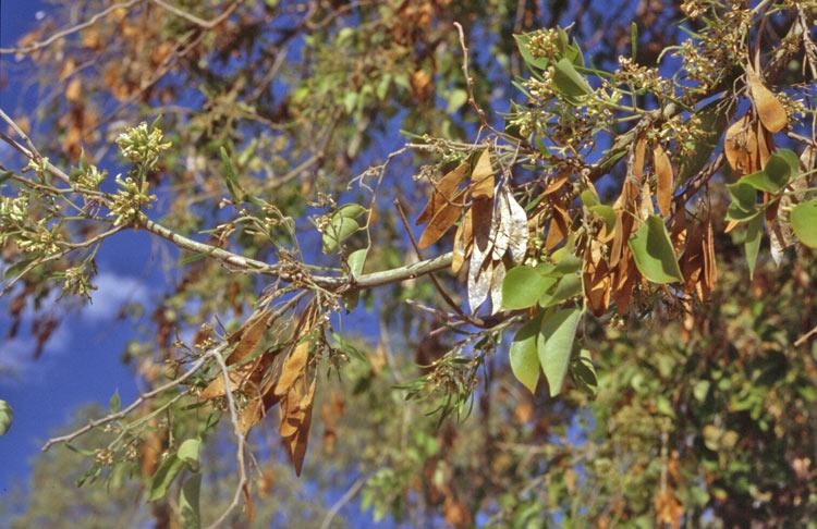 | Description | : | Tree with rough bark and mainly longitudinal furrows, young branch pubescent. Leaf imparipinnate, rachis c. 3.7-7.5 cm long; leaflets 3-5, c. 3.5-6.5 cm long, broadly ovate or suborbicular, acuminate, glabrescent, petiolule c. 5-8 mm long; stipules c. 5 mm long. Inflorescence an axillary panicle, composed of several short spikes with sessile to subsessile flowers. Bract small, pubescent, caducous. Calyx c. 5 mm long, teeth ciliate, unequal, shorter than the tube. Corolla yellowish white. Stamens 9, monadelphous, tube slit on the upper side only, anthers uniform. Ovary pubescent, 2-4-ovulate, style glabrous, stigma capitate. Fruit c. 3.7-10 cm long, c. 7.0-13 mm broad, strap-shaped, glabrous, 1-4-seeded. Seed flattened. Fl. Per.: March-May. |